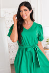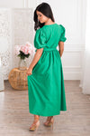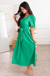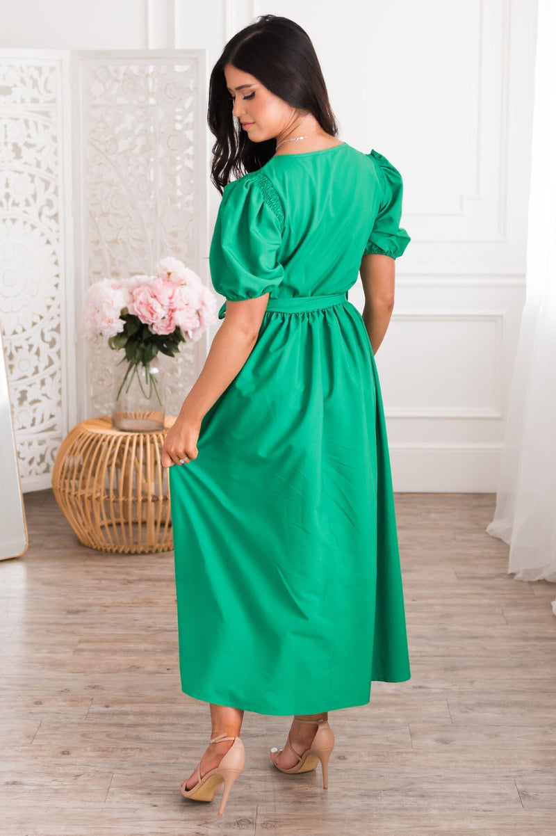 The colorful Madalene is a showstopper! We are so in love with the stunning kelly green fabric and feminine modest fit, we simply can not get enough! Also features, lovely short puff sleeves, flattering v-neckline with belt tie waistline and the perfect length flowy skirt. Get yours today!