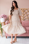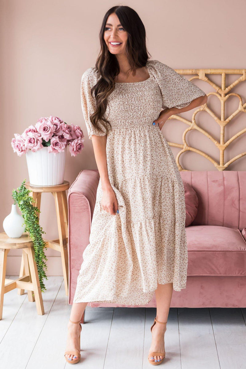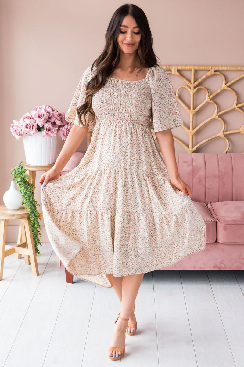 The Maddy is going to be your next perfect summertime go to! We are loving the modest square smocked bodice, half flutter sleeves and the most feminine tiered high-low skirt. Trust us, this one is a must have!