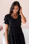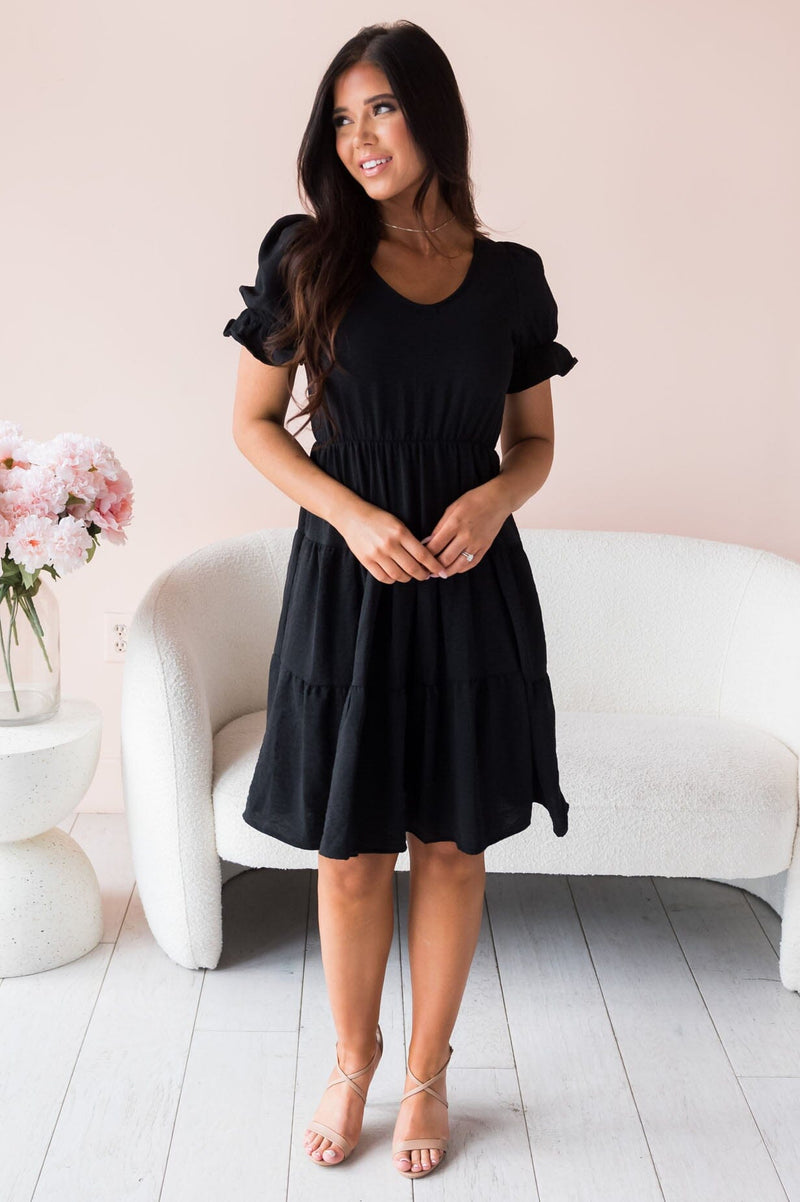 The new Madley dress will be nothing but darling on you! The beautiful classic black color is a beautiful addition to any wardrobe! We are so in love with the tiered skirt detailing, short ruffled cuff sleeves, elastic waist, and soft modest scoop neckline! Grab your favorite cardigan and go! Trust us, you won't want to miss out on this one!!