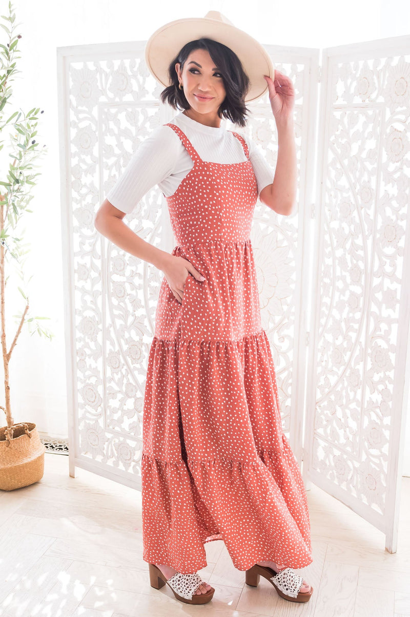 The Maebelle is the perfect dress for your wardrobe for any season! Featuring a gorgeous neutral clay color, beautiful feminine polka dot detailing, tiered maxi skirt and the most adorable jumper style with back zipper closure. We are in love with this one, trust us when we say add to cart now!