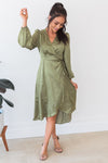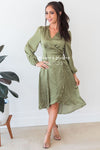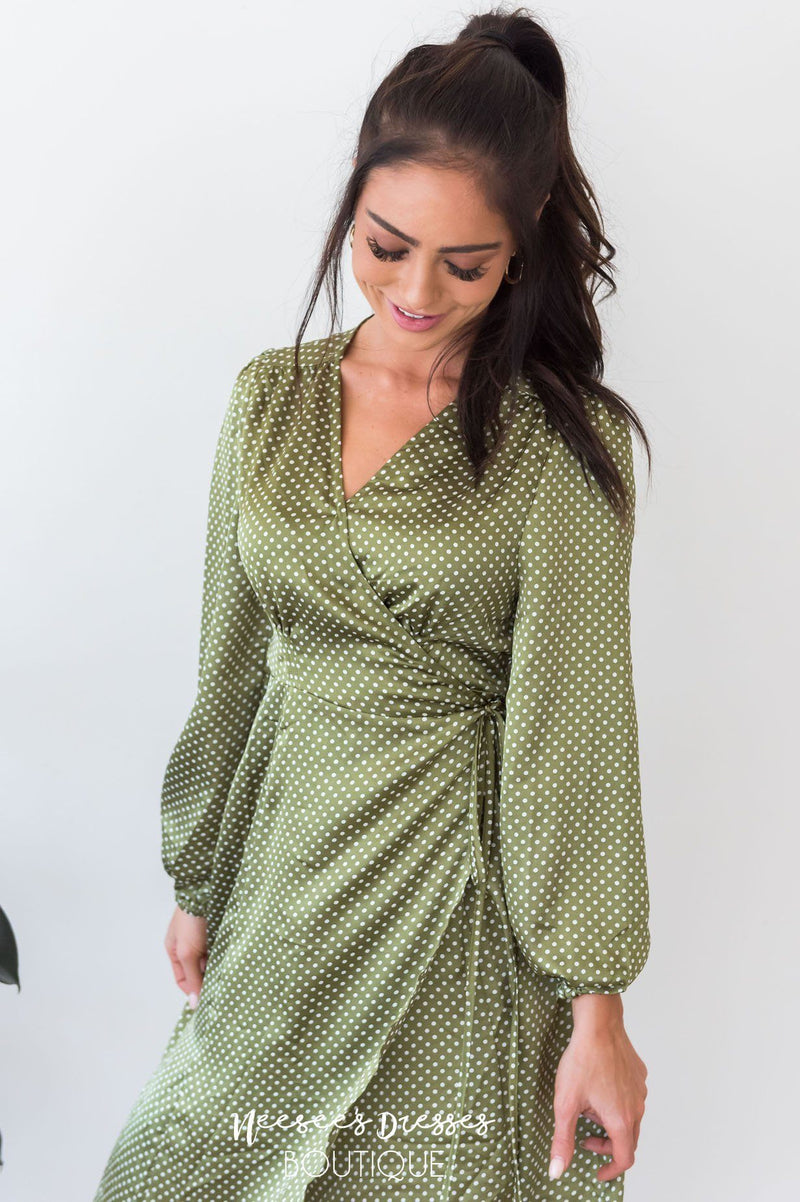 The classiest satin dress you will ever find! Featuring the softest, classiest olive and ivory dot satin fabric, a true wrap style dress & long sleeves! These will go quickly, add to cart now before they are gone for good!