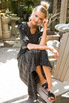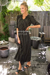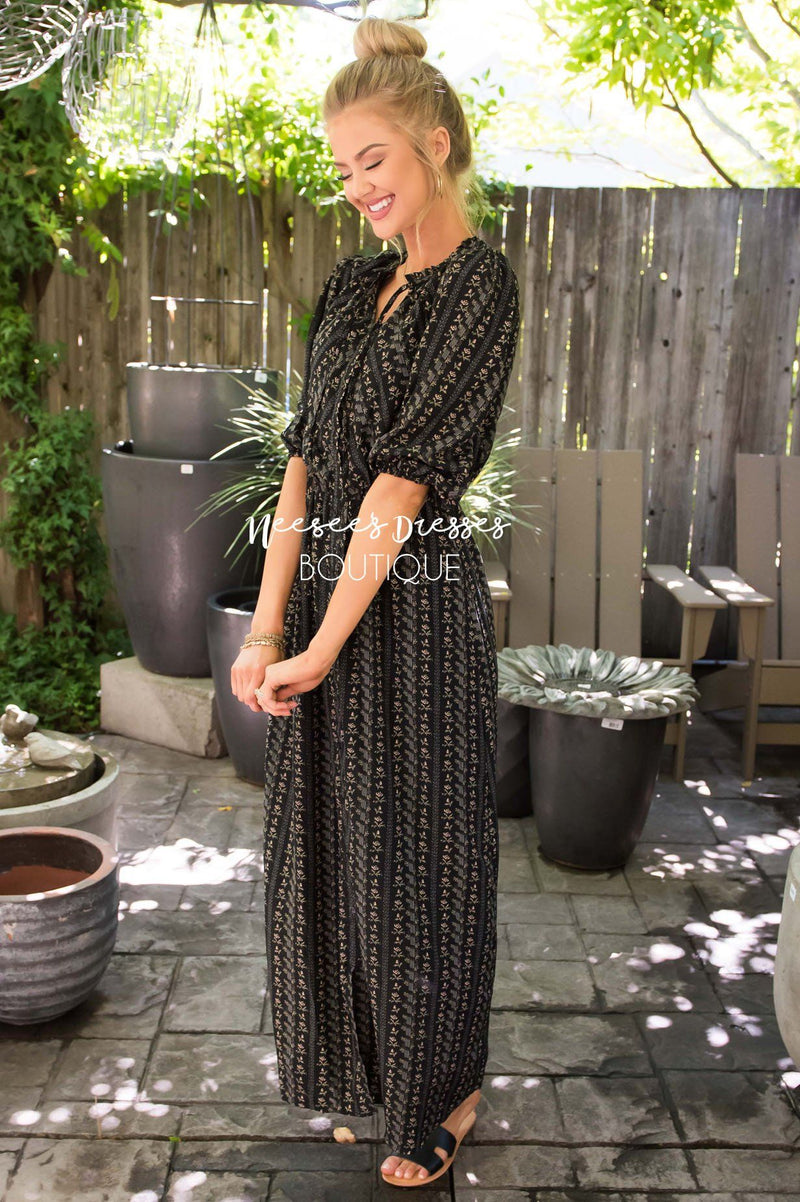 You can never go wrong with a gorgeous patterned dress! This adorable New black maxi dress features white, cream & rose colored patterns, a ruffle collar with a tie neck, 3/4 length puff sleeves, a function button front bodice, fitted waist and is lined! This dress is also nursing friendly!