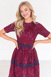 If you are in love with our New Melana dress you are bound to be head over heals for our New Maevery! Featuring similar style with the classiest addition of two tone colors of burgundy and navy, a gorgeous floral lace overlay, a round ruffle neckline, short sleeves, zipper back closure, and the perfect modest length. Add to cart now, these beauties will not last long!