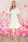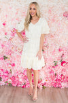 We are head over heals for this feminine beauty! The Magnolia has the most gorgeous textured floral fabric, soft v-neckline, half double flutter sleeves, elastic waist and a darling ruffle hemline. This one is an absolute must have!!!