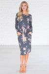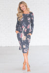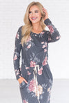 The Maia quickly became one of our favorites! We love the charcoal floral color with floral print, it gives this Maia the perfect pop of color! Featuring a round neckline, long sleeves, super soft and cozy material and a drawstring waist. Get yours today!
