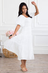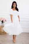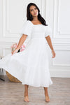 Prepare to have your breath taken away! The perfect dress *does* exist: Meet our modest Makayla Dress. This breathtaking dress features a square neckline, banded empire waist, short puff sleeves, a comfortable smocked back bodice, tiered skirt and delicate floral embroidery.