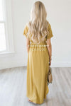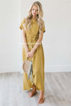 Our coveted Maleah Dress will be an instant sell out! If you have had your eye on this dress, do not wait to purchase it or it will be gone! Beautiful rusic gold dress has short sleeves, a gathered waist, waist tie sash and a wrap style skirt. Lined.