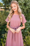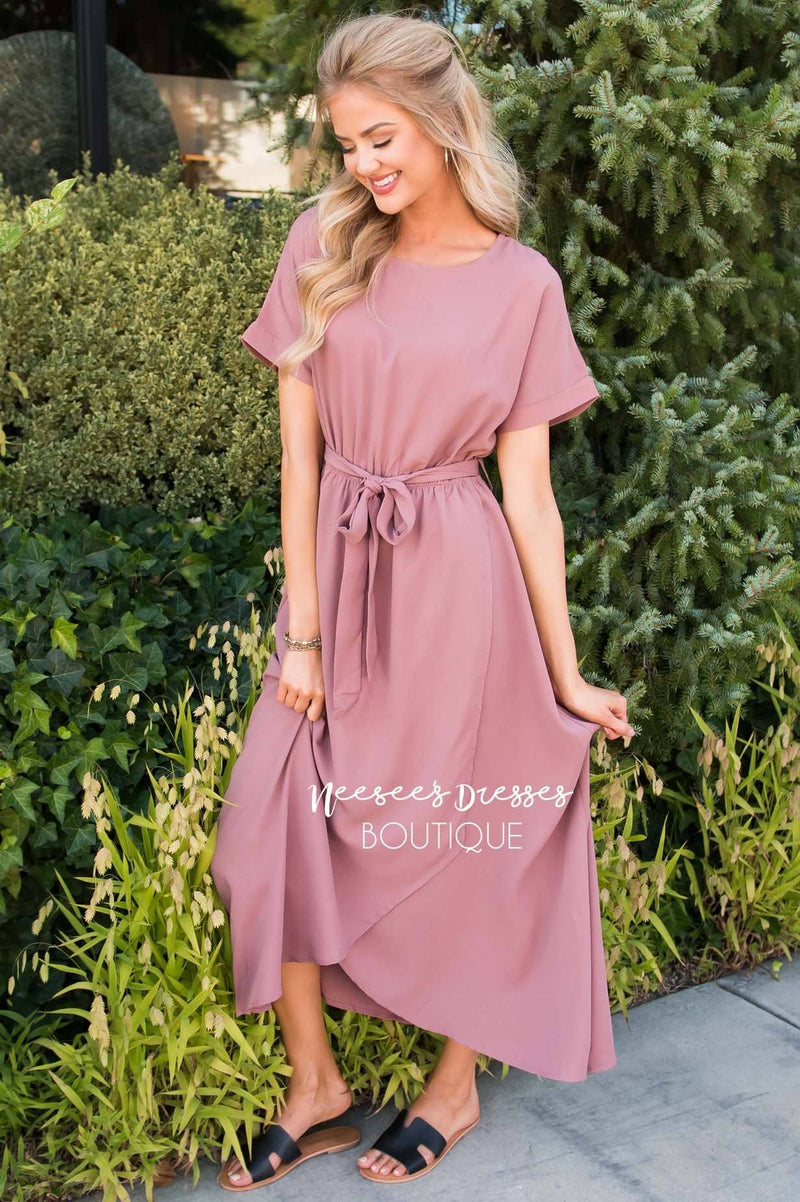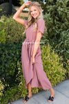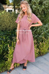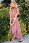 Our coveted Maleah Dress will be an instant sell out! If you have had your eye on this dress, do not wait to purchase it or it will be gone! Beautiful dusty rose dress has short sleeves, a gathered waist, waist tie sash and a wrap style skirt.