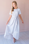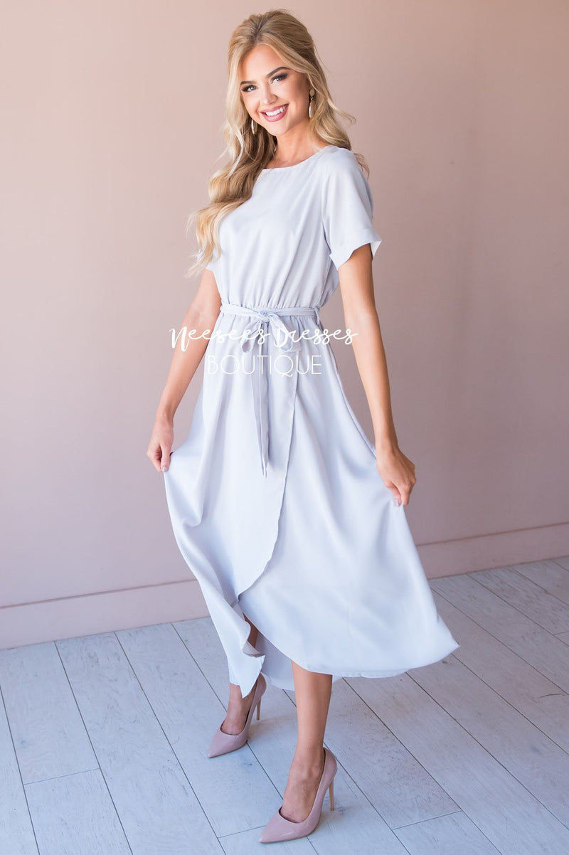 We run out of flattering words to use when describing the New Light Grey Maleah! It's so flowy and feminine, the perfect addition to everyone's closet,for any season. Featuring a rounded neckline, short cuffed sleeves, belt tie waist and the ever lovely high/low wrap style skirt. Just say yes to the dress and get it today!