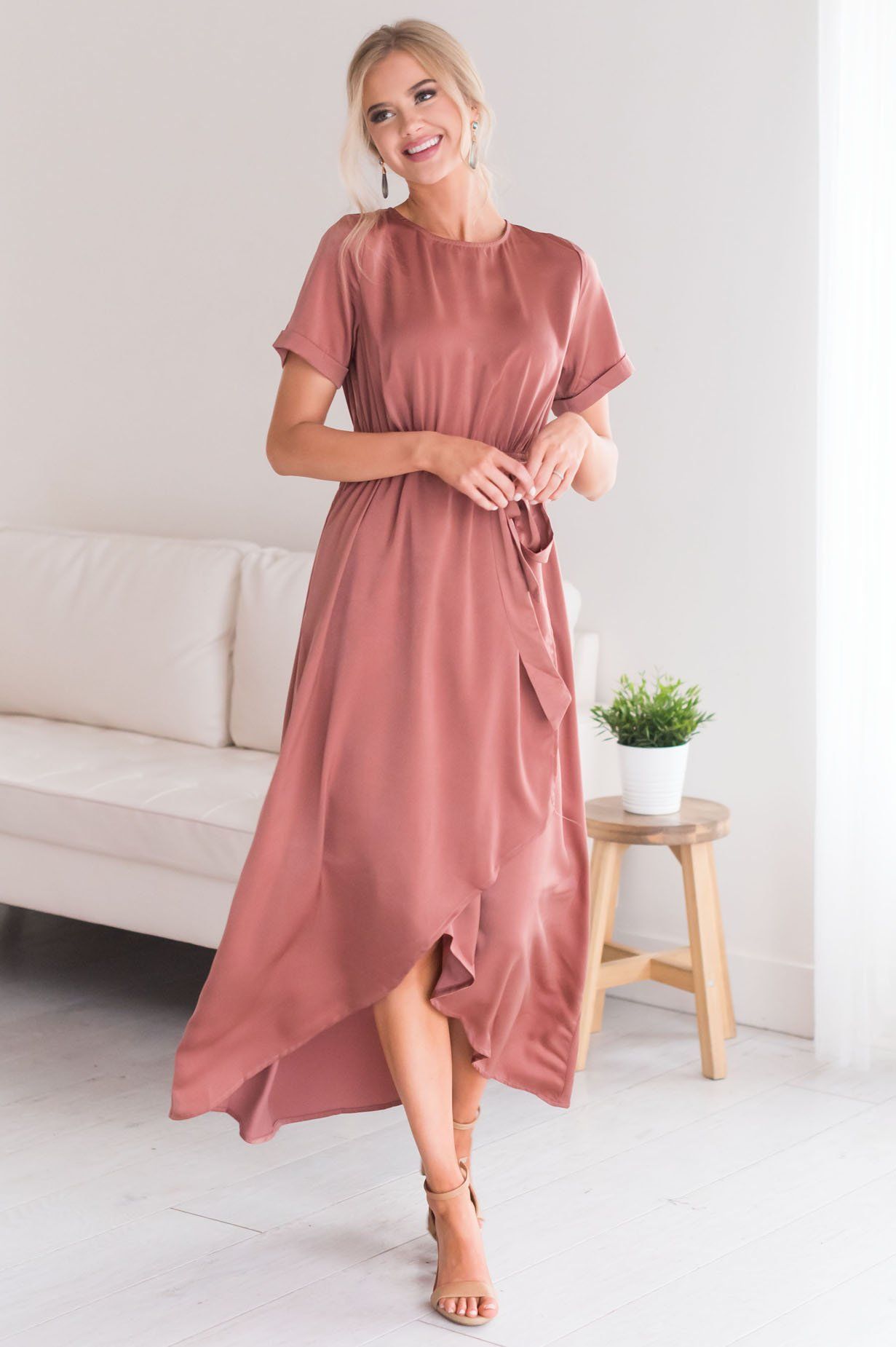 We run out of flattering words to use when describing the New hibiscus mauve satin Maleah! It's so flowy and feminine, the perfect addition to everyone's closet, for any season. Featuring a rounded neckline, short cuffed sleeves, belt tie waist and the ever lovely high/low wrap style skirt. Just say yes to the dress and get it today!