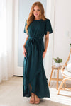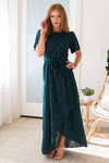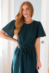 Your new favorite dress is here, and won't last long. Calling all ladies; this dress is the perfect dress for your holiday line up! Featuring a classy shimmer hunter green fabric, rounded neckline, short flutter sleeves, belt tie waist and lovely tulip skirt. Act fast because these beauties won't last!