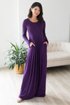 The perfect maxi dress has just arrived, trust us, you will want this modest beauty! Features include a darling round neckline, pleated waistline, long length sleeves and the perfect rich plum color! Get yours today!