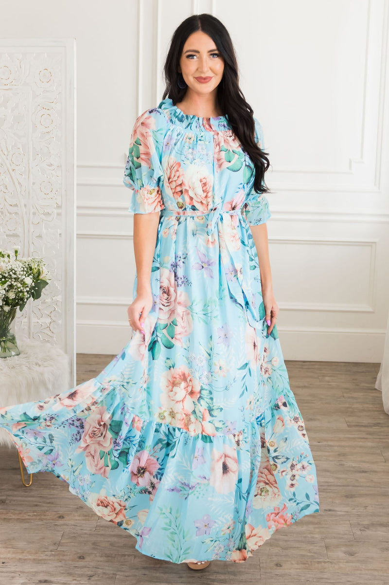Your maxi dress dreams just came true! The Malorie has all of our favorite features in one of our favorite florals! This darling maxi has short cuffed puff sleeves with a high modest ruffle neckline, belt tie waist and perfect maxi length! This one is a must have and will not last long, trust us!
