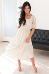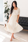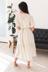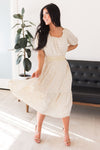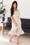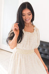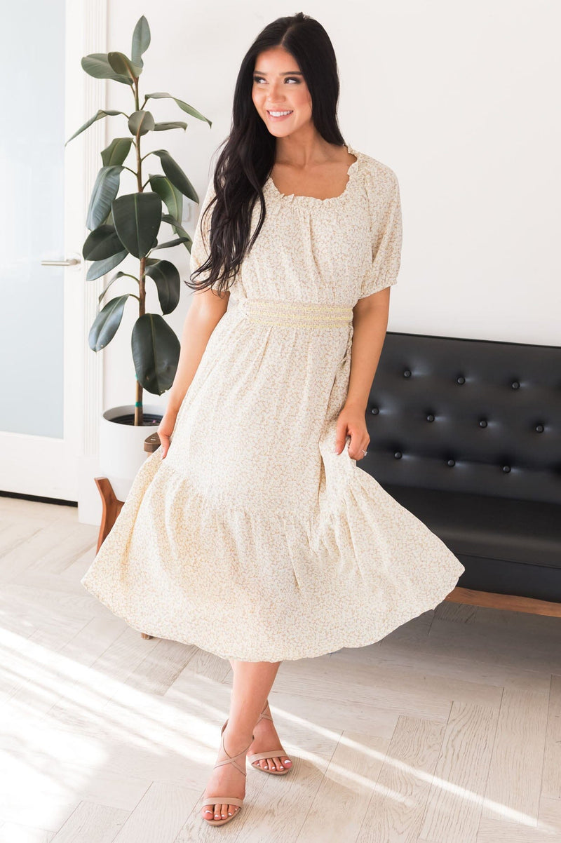 The Maralou has us dreaming of warm Springtime days! This darling smocked tie waistline floral has stolen our hearts! Featuring the most gorgeous floral print, round ruffled neckline, short sleeves, & tea length skirt. Get yours today!