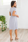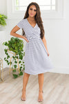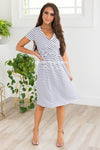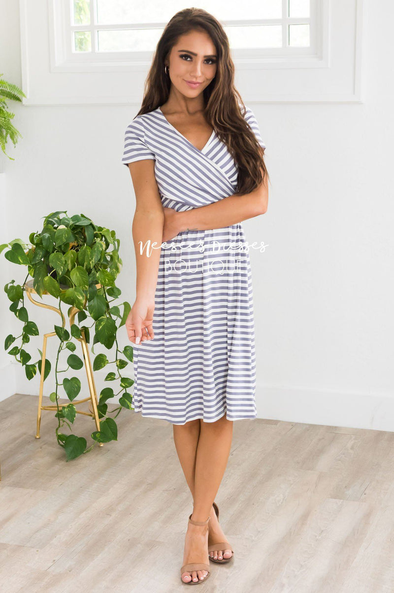 The Marcie has arrived and we are beyond excited! This lovely feminine striped beauty steals the spotlight! Featuring Soft v-neckline with unique criss-cross bodice detailing, short sleeves and the perfect modest mid-length.