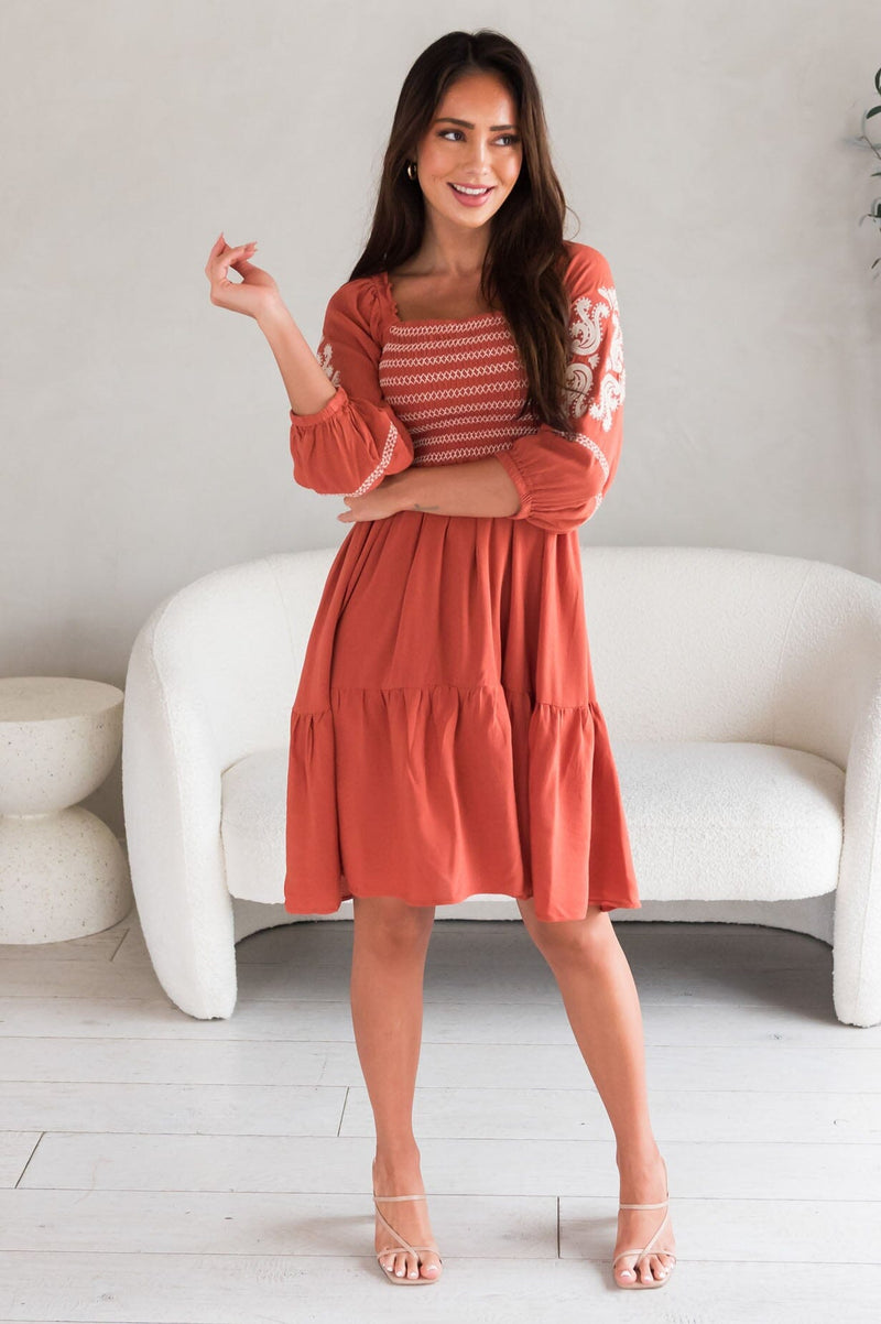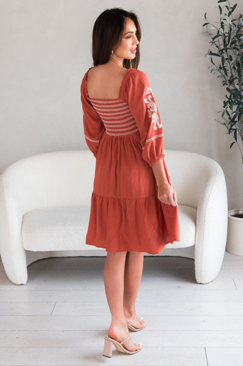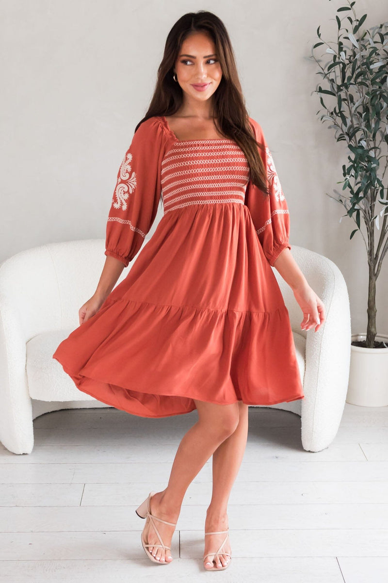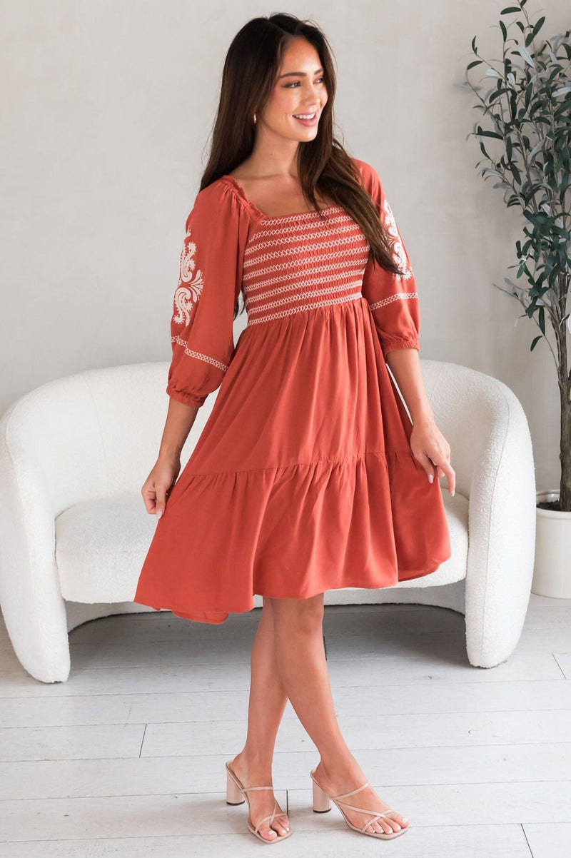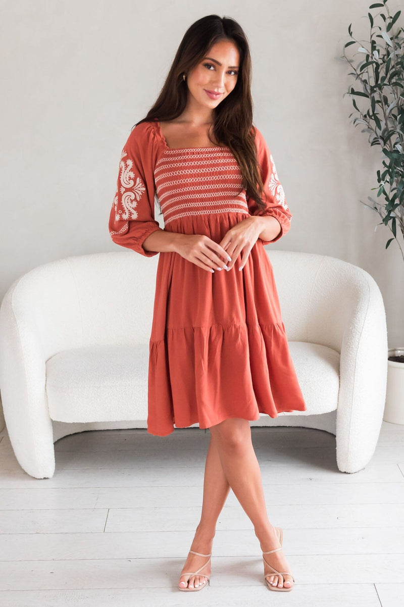 We are proud to bring the new Margi! This darling contrast embroidery dress is bound to make an impact! Features modest square neckline, smocked bodice, quarter length sleeves, delicate embroidery detailing and on the gorgeous flowy skirt. Get yours today!