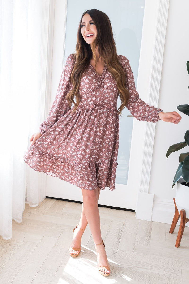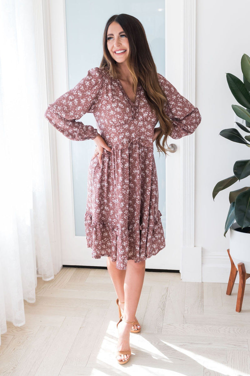 The gorgeous Mariana has arrived just in time for fall! We are loving the long sleeves, the beautiful redwood color, dainty ivory floral throughout, and ruffle detailing on the bodice and hem! You can't go wrong with this one, get yours today!