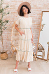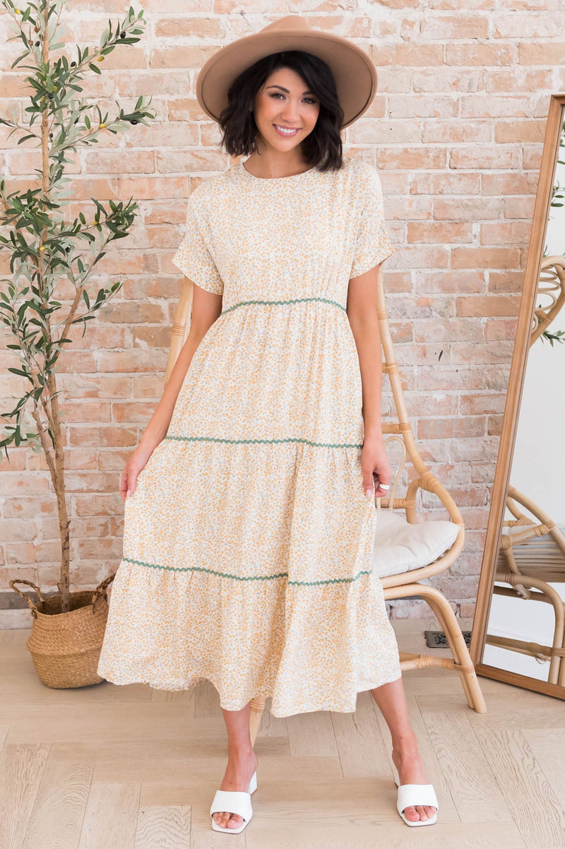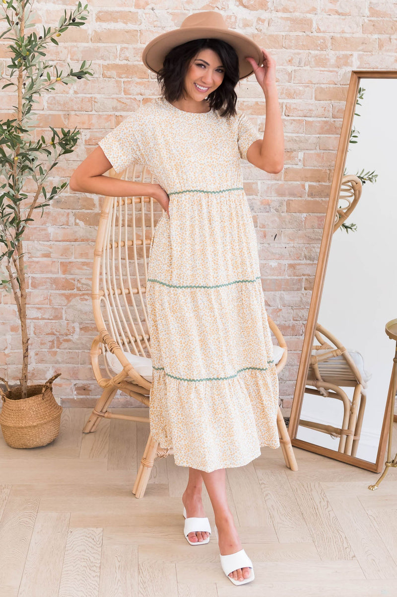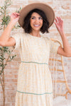 The Maricela dress will be your next favorite flowy maxi! Do not miss your chance on snagging one of these beauties. Featuring a lovely mini floral, short sleeves, and tiered maxi length! These will go quick! So get yours today.