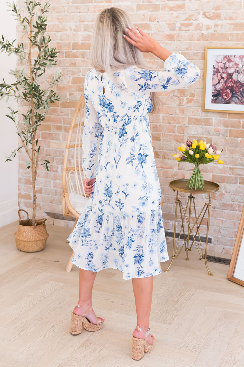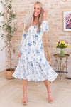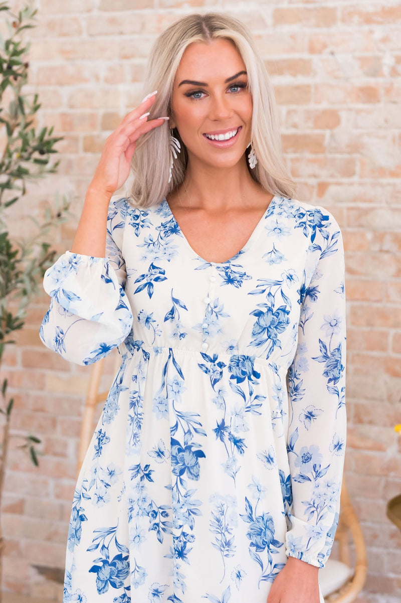 We just brought you the most elegant and oh so boho floral beauty! Features include soft scoop neckline with darling faux button detailing, long sleeves and our favorite tea-length ruffle hemline skirt. Get yours today!