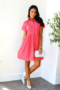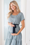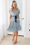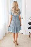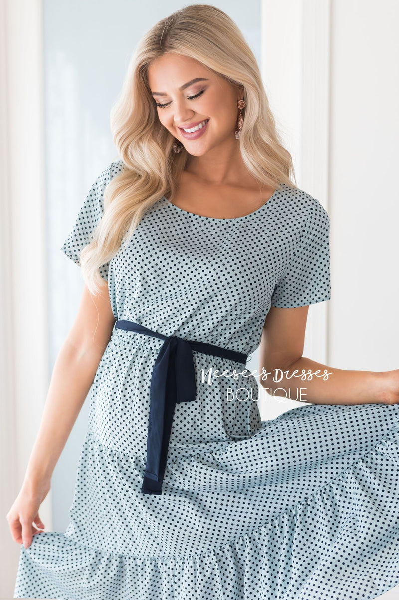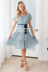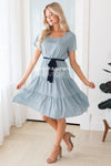 The Marlowe is a feminine flowy dream come true! Featuring the most darling soft blue and navy polka dot pattern we have ever seen! Modest round neckline, short sleeves, elastic waist with belt tie and a to die for flowy tiered skirt! Get yours today!