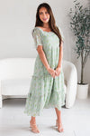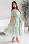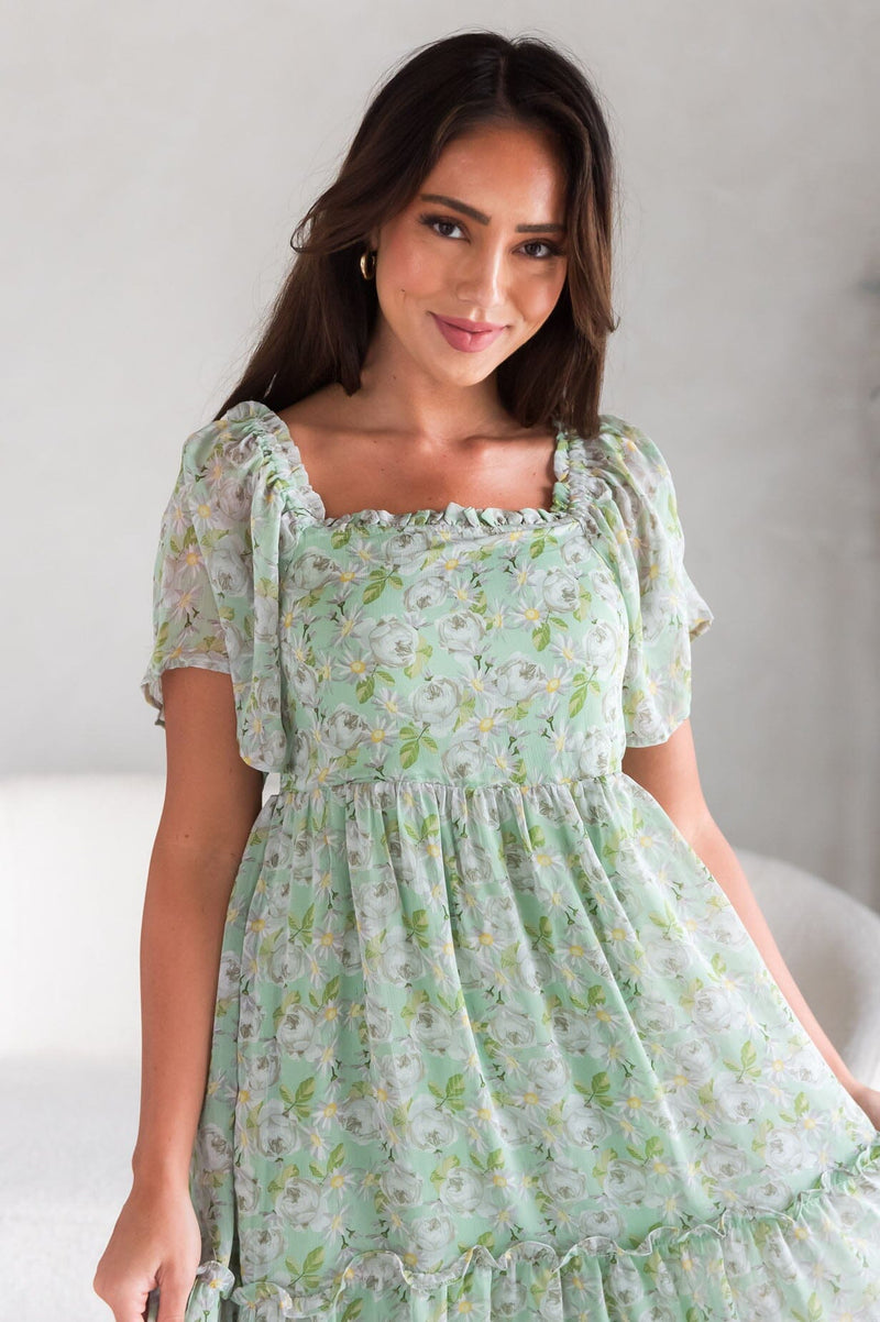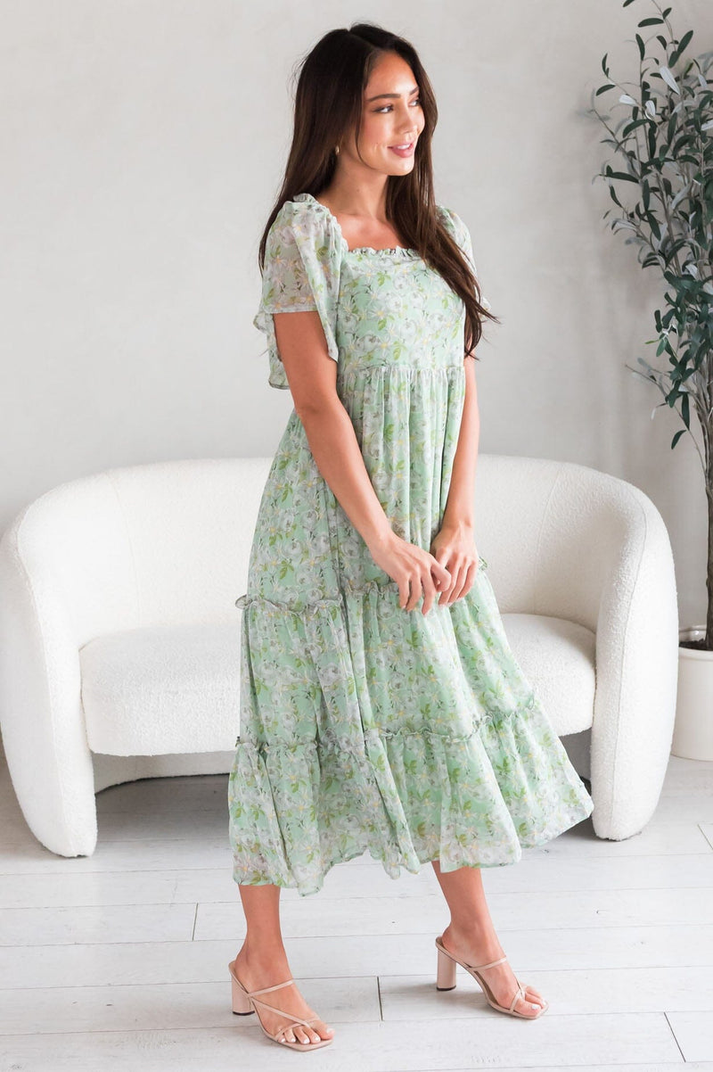 We have fallen hard for the new Marnie dress! This flowy and oh so feminine dress is a serious must have! Featuring short flutter sleeves, empire fit bodice and a sheer flowing ruffle tiered skirt. This dress is lined everywhere except the sleeves.