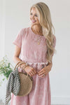 This lovely modest Marta has stolen our hearts. From the petal pink color to the lovely embroidery details! Get yours today.The Marta features soft ivory embroidered details short sleeves and a tie waist!