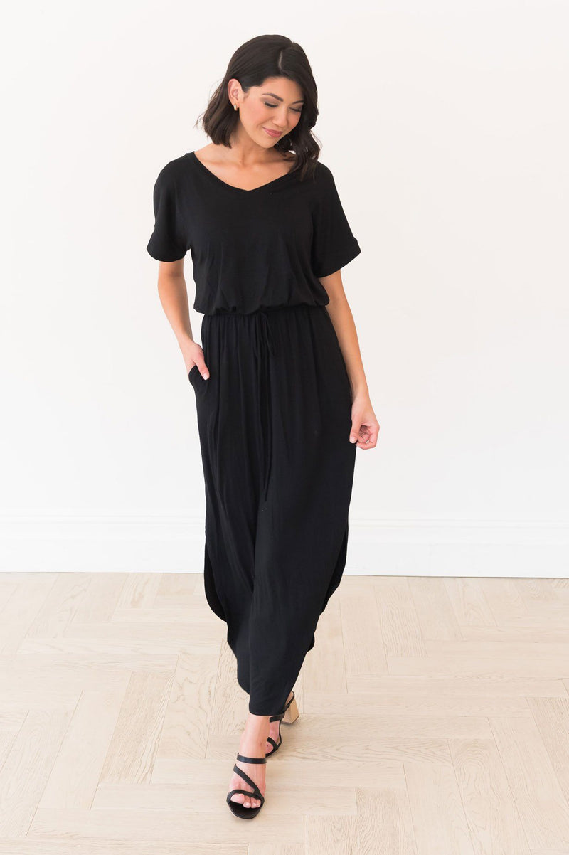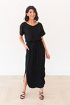 The Marta is truly the perfect summer dress! Casual, comfy, cute and light weight; you will grab for this modest dress time and time again! Featuring a V-neckline, a simple yet gorgeous black color, elastic waist with a string tie detail, side slits, a rounded hem, and side seam pockets. You'll want to grab this new arrival before its gone!