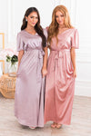 We are in love with stunning new Mathilda maxi dress! This gorgeous, modest, shiny satin beauty, is a true must have! Can you say *perfect* bridesmaids dress?! Featuring a vneck bodice, short sleeves, belt tie waistline & flowy maxi skirt.