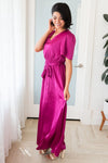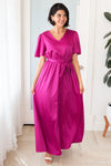 We are in love with stunning new Mathilda maxi dress! This gorgeous, modest, shiny satin beauty, is a true must have! Can you say *perfect* holiday dress?! Featuring a v-neckline bodice, short sleeves, belt tie waistline & flowy maxi skirt.