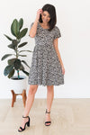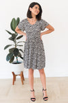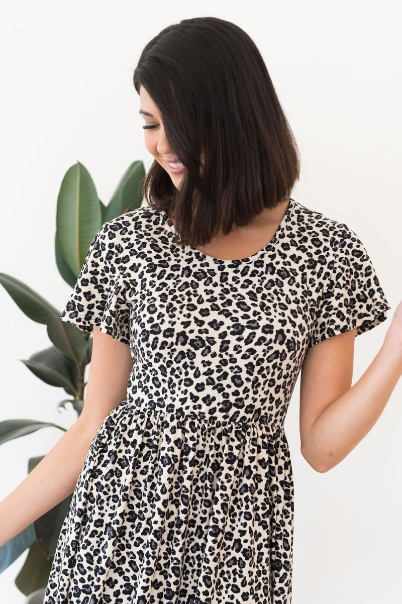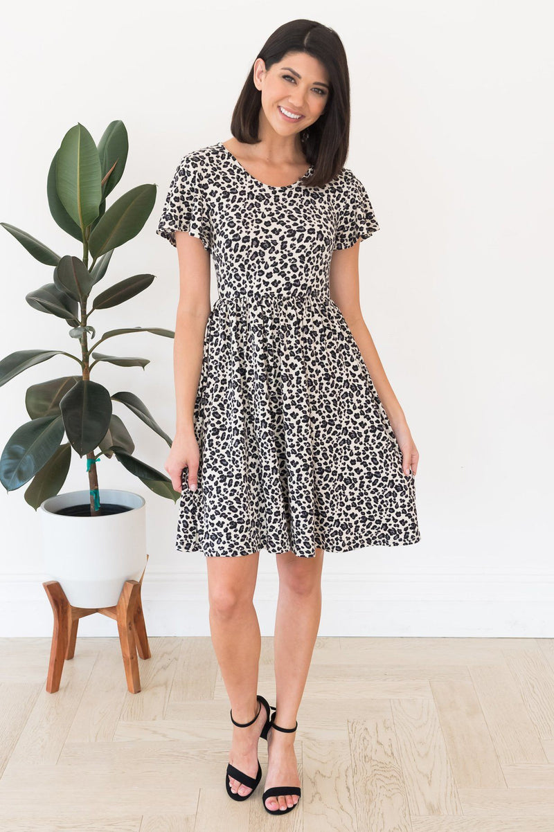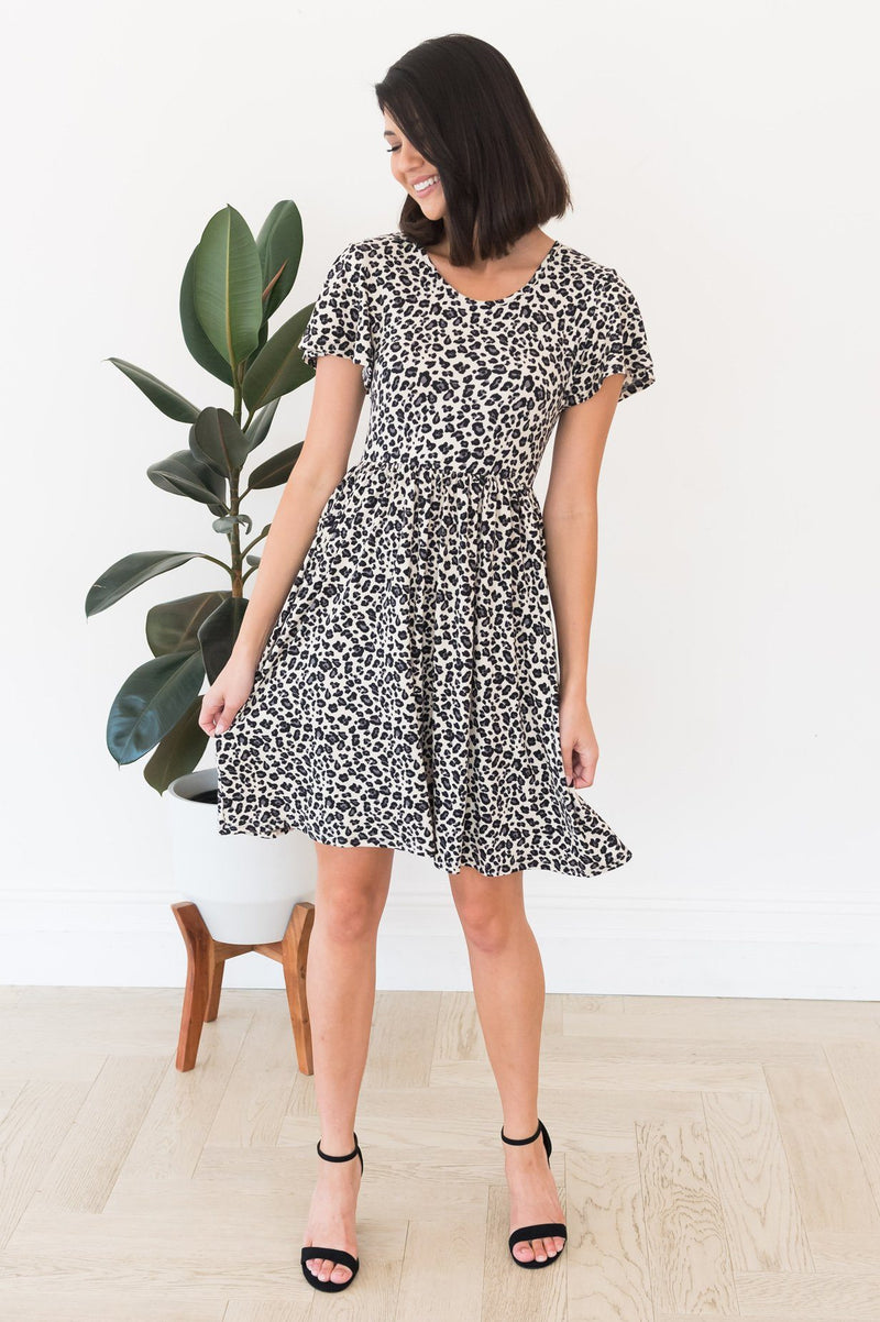 The Maude is here and we are in love! Featuring a rounded neckline, a gorgeous cream color with brown cheetah print throughout, an elastic waist, short flutter sleeves, and the perfect tea length skirt! We can't get enough of this beautiful new arrival! Get yours soon!