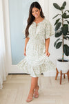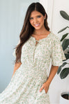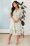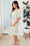 Be prepared to be amazed! This darling McKenzy dress is so flattering and fun! Featuring the most gorgeous sage, ivory, mauve and jade floral print, half length flutter sleeves, smocked waistline pockets, and the most flattering tie neckline detailing. Get this feminine beauty today!