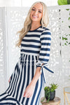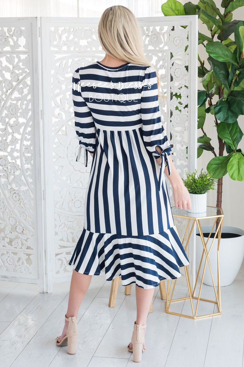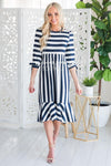 The Mckinlee Modest ruffle hem dress has arrived for every single one of your spring and summertime events! This cozy yet classy little gem has all the best features, to include, 3/4 length sleeves with a cuff tie detail, darling navy stripes, elastic waist and our favorite ever ruffle hemline! Get yours today!