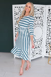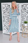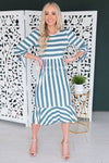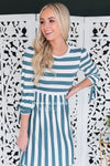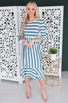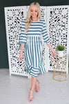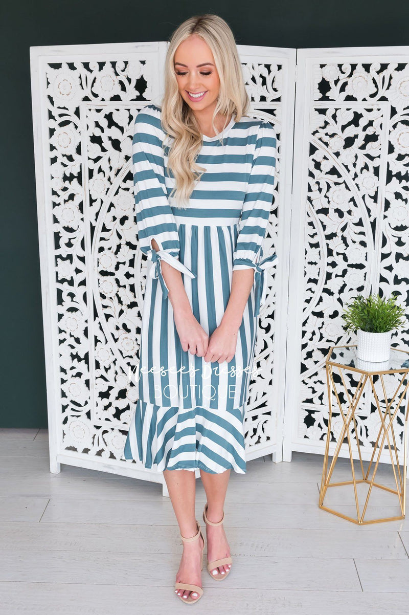The Mckinlee Modest ruffle hem dress has arrived for every single one of your spring and summertime events! This cozy yet classy little gem has all the best features, to include, 3/4 length sleeves with a cuff tie detail, darling dusty teal stripes, elastic waist and our favorite ever ruffle hemline! Get yours today!