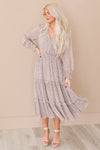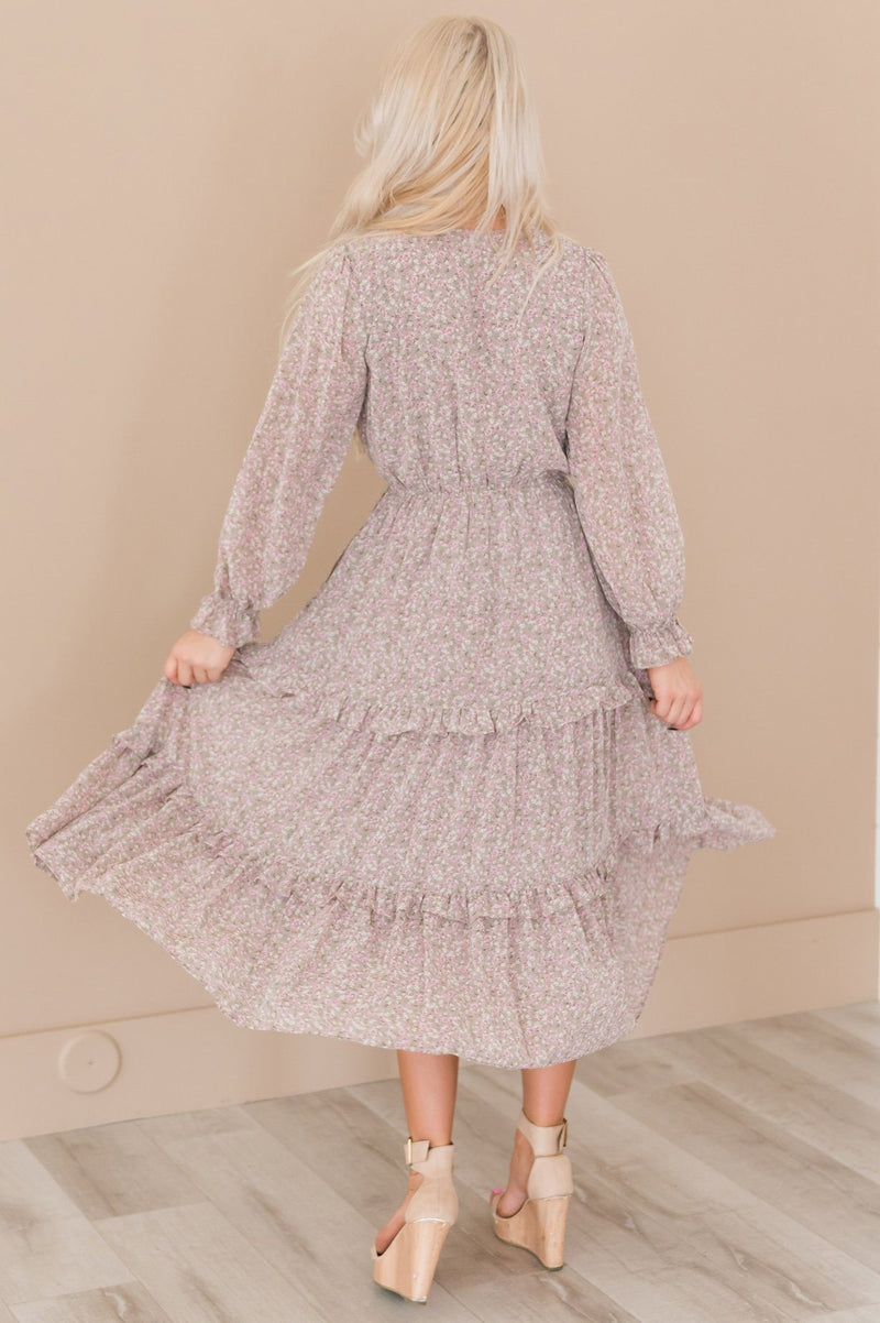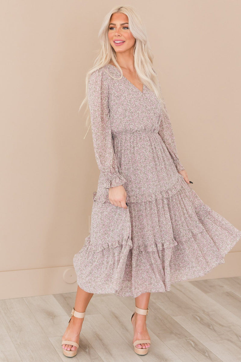 The perfect modest nursing friendly dress just went live! We love the delicate floral print, it is so classy and feminine! Dress features include, crossover bodice with button closure, elastic waistline, long sleeves and a gorgeous flowy ruffle tiered skirt.