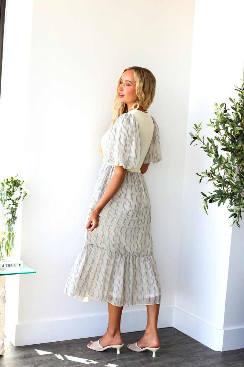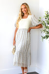 The Melony is as adorable as they come! This cute cream ribbed sweater vest style top paired with the lovely blue pattern skirt had our attention at first sight! Features include, short bubble sleeves and a soft feminine ruffle hem skirt. Get yours today!