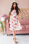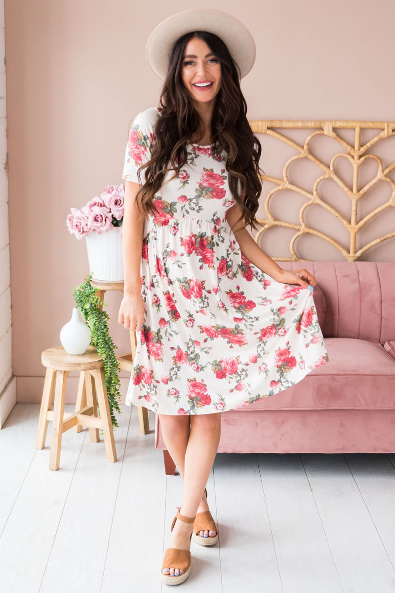 We cannot get over this fabulous and detailed rose floral The Melynda has to offer! We adore the draped waistline to the short sleeves make up for a flattering and modest fit! We know this perfect summer floral is going to sell out fast!