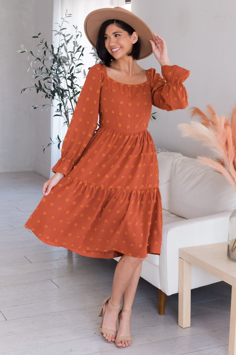 Our new Meri dress is simply divine! You do not want to miss out on this happy little modest dress. Features include, squared neckline, long ruffled cuff sleeves, tiered mid-length skirt, & gorgeous swiss dot material. Get yours today!
