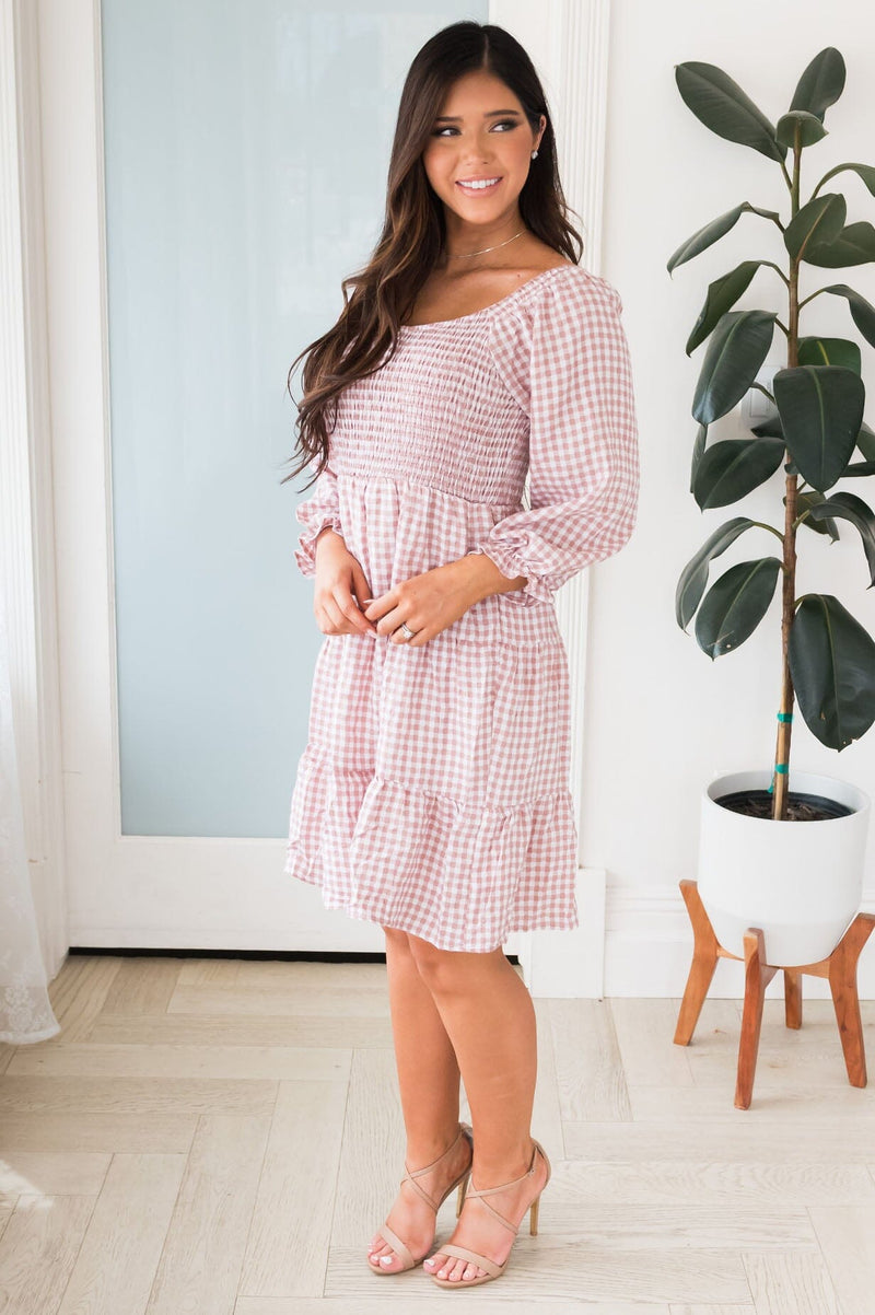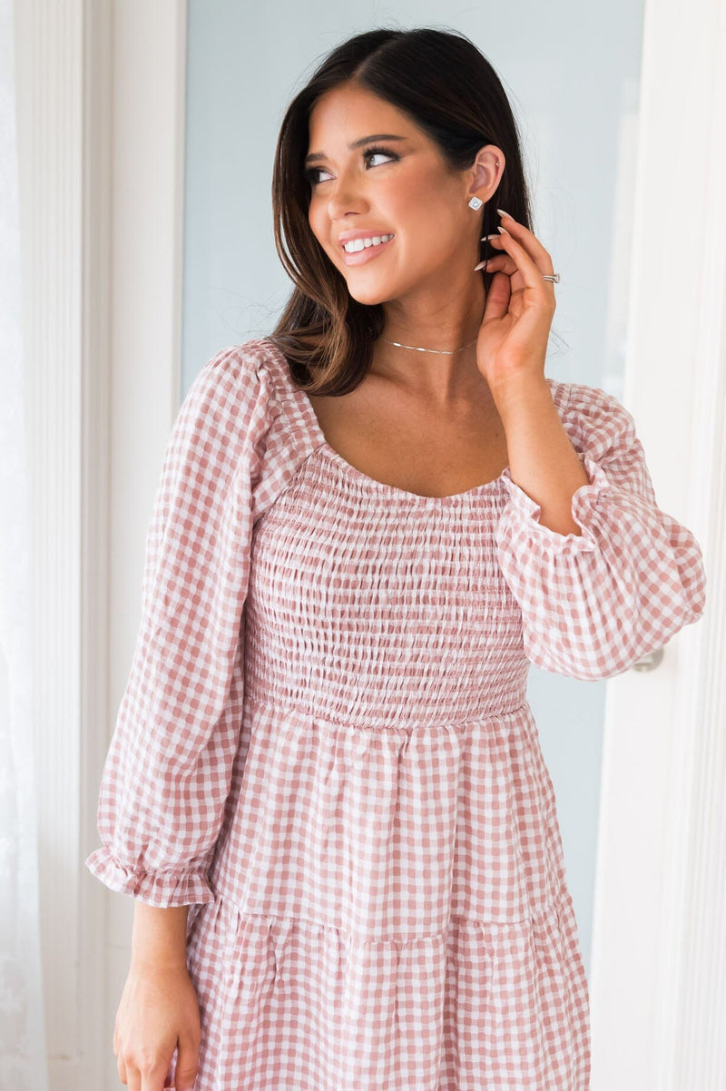 Make way for our new simple yet so stylish Meribeth dress! This dress just radiates beauty! Features include a round modest high neckline with a smocked bodice, long sleeves, and darling flowy tiered skirt! The dashing check print will have catch everyone's eye!