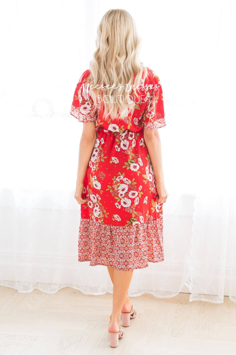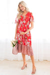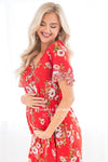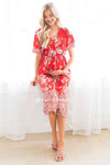 This darling flowy feminine dress has us doing a double take! We had to have it and you will too! Featuring gorgeous red floral patterns, faux button front detailing, short flowy flutter sleeves, an elastic waist and a lovely contrast pattern ruffle hemline. It is a must have!