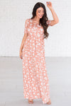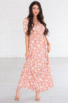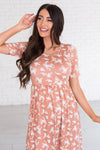 This dazzling gem of a gown is sure to be perfect for any event you might have coming up! This floral print, modest fit, and simple design is nothing short of beautiful! The sandy coral color will pair greatly with any accessories you choose!