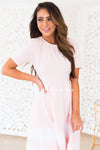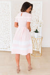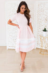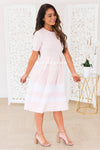 This lovely modest Mira is a total must have! Perfect for any and all occassions with it's elegant fit and flare style paired with the block white striping on the skirt hemline, it's a true classy piece! Grab your favorite accessories and you are on your way!