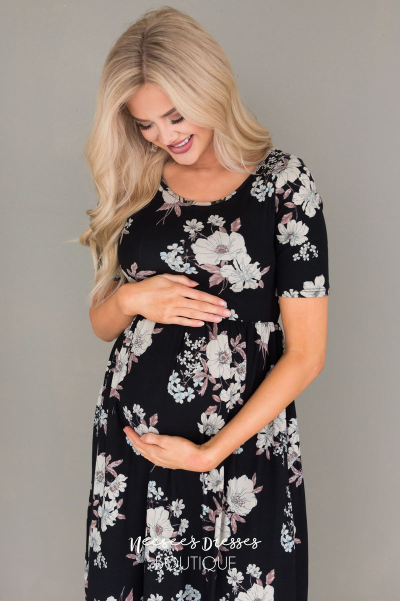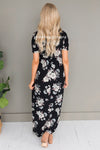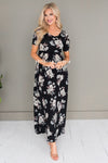 It was love at first site with this maxi dress and it will not last long! The Miranda is made of the softest material! You will look amazing but feel like you are in your pj's, talk about a win-win! Black dress featuring a gray and mauve floral print, a gathered waist and half sleeves. Dress slips on and has stretch to it!