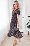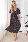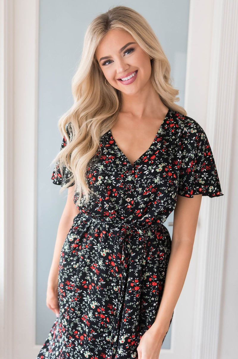 This gorgeous maxi dress is so flowy and feminine; we simply can not get over it! We just love the beautiful rich black color and dainty red and light mint floral details, along with the short flutter sleeves. This modest maxi dress is a must have for any season!