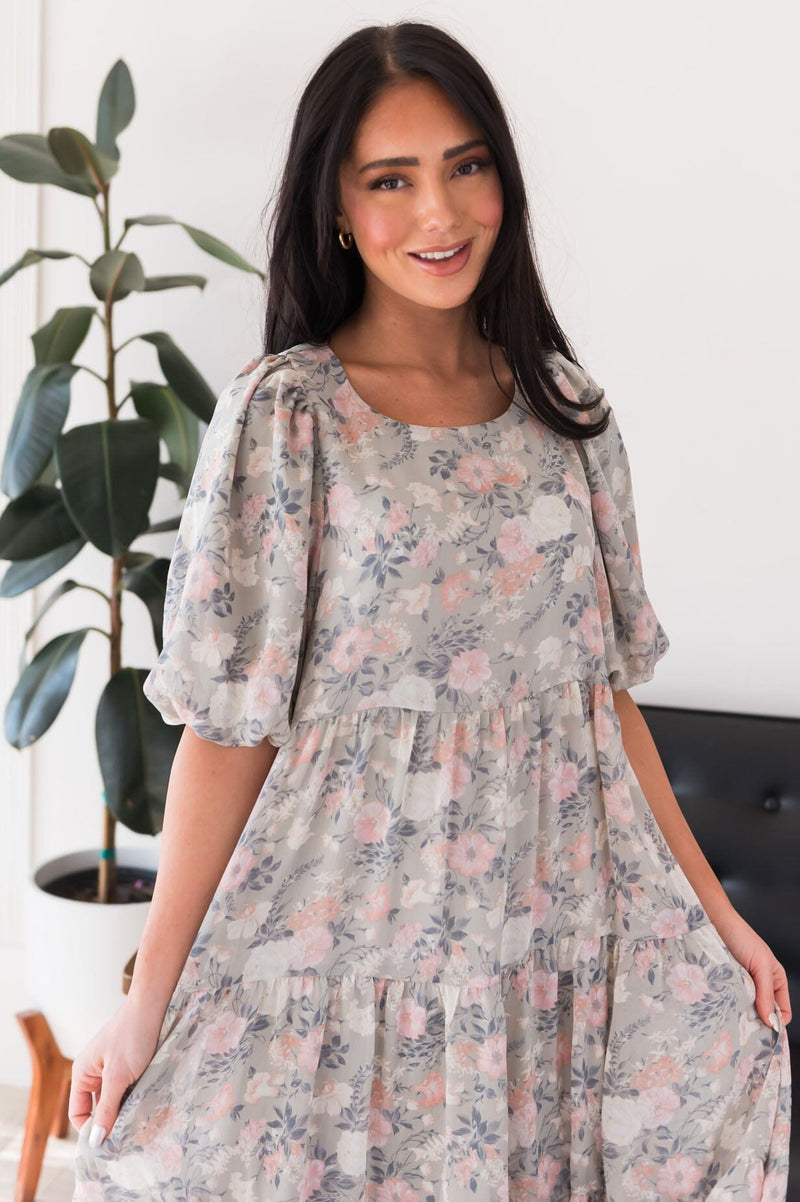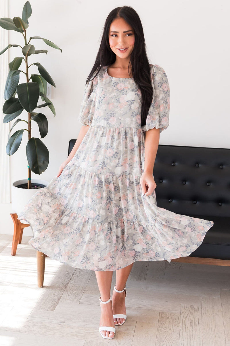 The new Monika chiffon floral screams elegance! We are so in love with the trendy half length puff sleeves, flattering rounded neckline, shift style & flowy tiered skirt. We simply can not get enough! Act fast and snag yours before they are gone!
