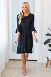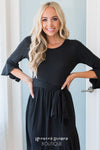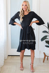 Our absolute new favorite! The Monti is perfection, this gorgeous mid-length dress features a modest round neckline, 3/4 length cross flutter sleeves, cozy soft stretch material, belt tie waist and last but not least the darling faux wrap skirt! These will go quick, get yours before they are gone!