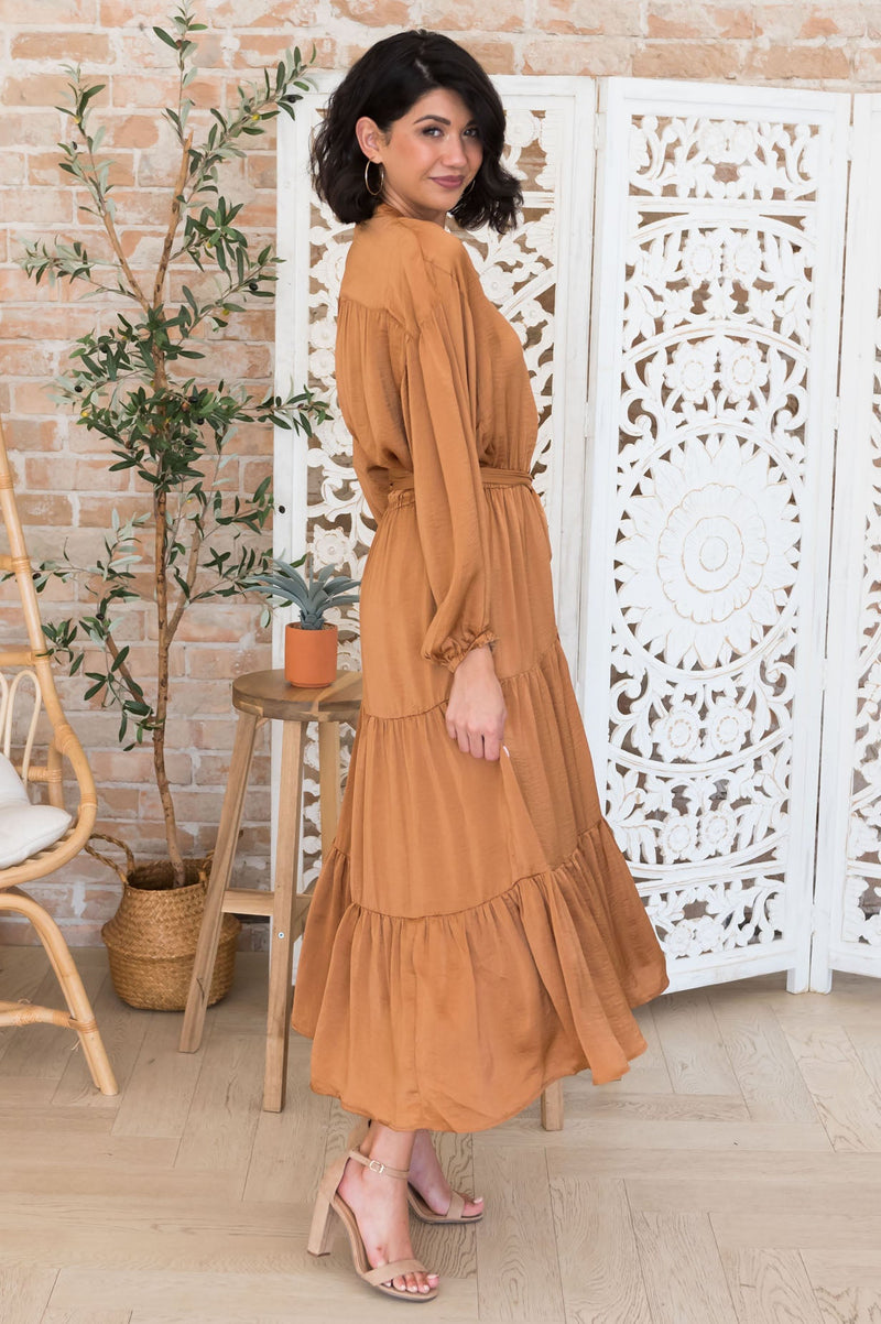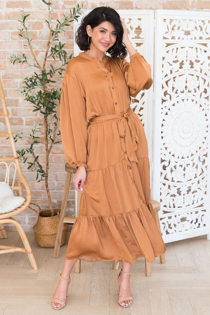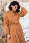 The perfect dress to flawlessly transition from summer to fall and every season in between! The lovely rich camel color, flowy maxi skirt and long puff sleeves are so classy! Get your Morgan today before they are gone!