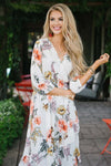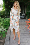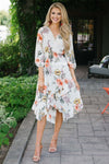 The Nalia is the perfect dress or an occasion! This dress features a faded coral orange, mauve and gold floral print, a cross over front, 3/4 length sleeves, an elastic waist and a high low skirt with a ruffle hem!
