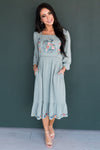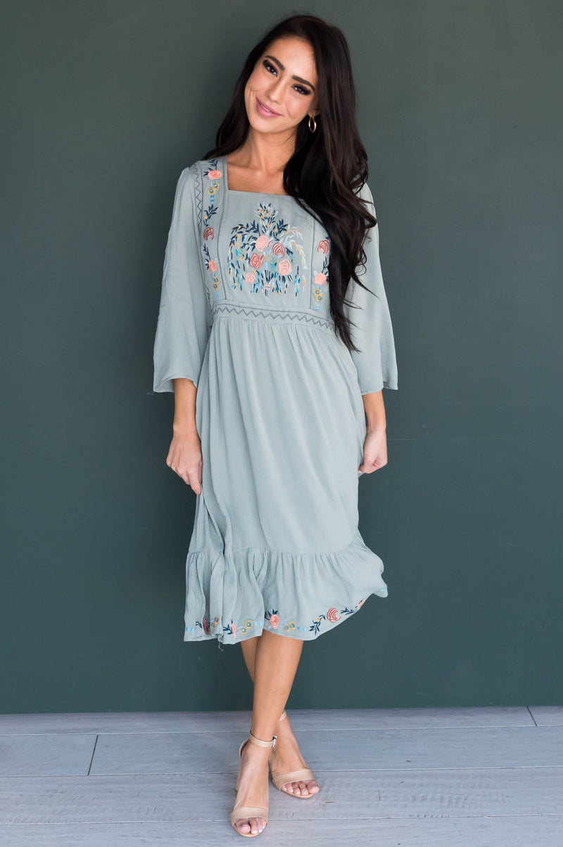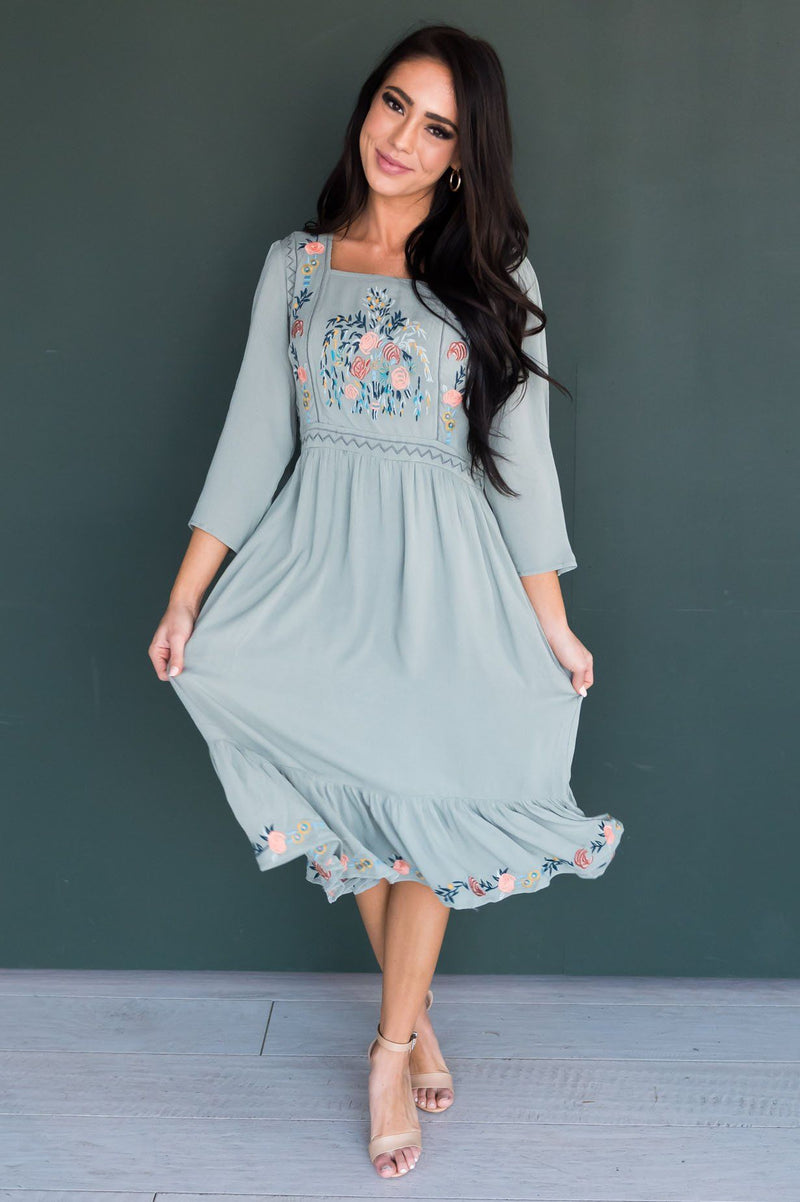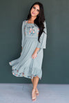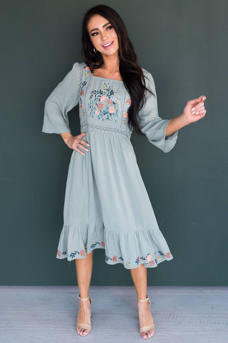 We love embroidery and an embroidered dress with a darling feminine ruffle hemline! We simply can not get enough of the lovely Narissa! Featuring squared neckline, 3/4 length sleeves, embroidered floral detailing on the bodice and gorgeous ruffle hemline! This one is must have!