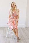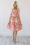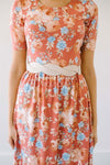 Adorable fit and pretty floral print! You are going to love the Natalie! Dusty pumpkin colored dress features a sky blue and cream floral print, half sleeves, a round neckline and elastic waist. Dress slips on, belt and accessories not included.