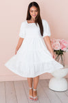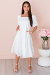 We give our new Nathaly dress five stars! This one is so elegant and beautiful you have to see it in person. This beauty features; a classy squared neckline, half length puff sleeves, pockets, tiered skirt and the most gorgeous off white classy color. Get yours today!